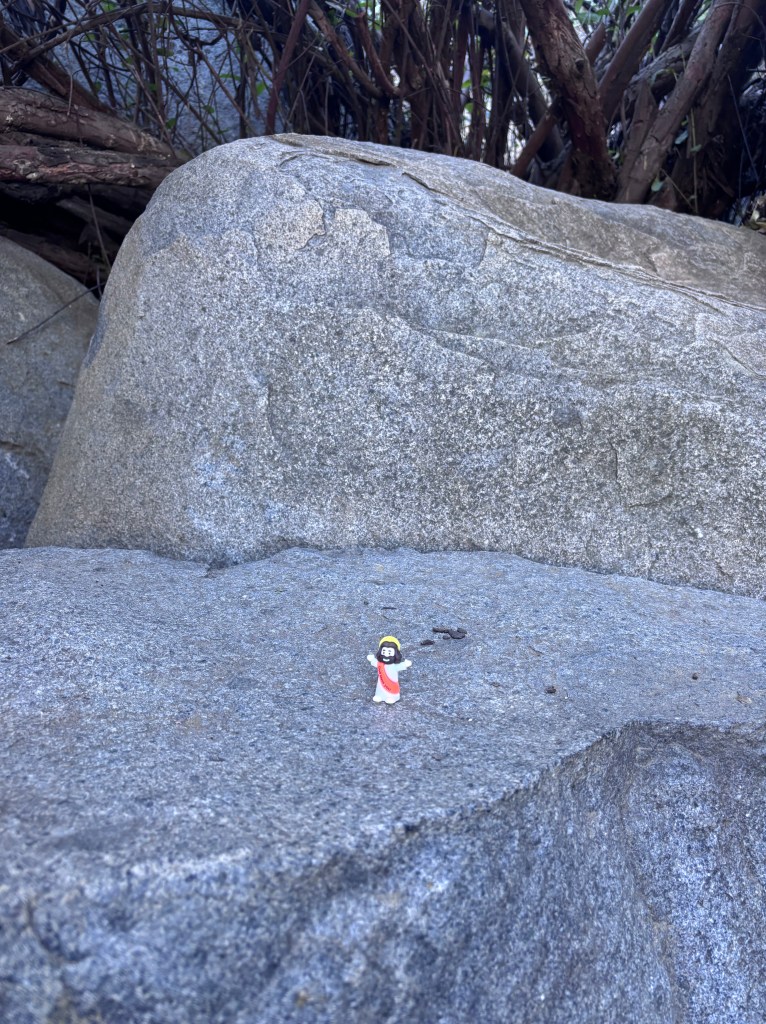 Al final de la caminata recibí una revelación más óptica que religiosa. La satisfacción de que mis ojos aún se enfocan lo suficiente como para detectar figuras del tamaño de un confeti. Y creer que, si algún día pierdo la fe, siempre puedo seguir el rastro de Jesús diminutos que como migas sagradas me guíen, hasta encontrar el camino de vuelta… o al menos un buen motivo para jugar y sonreír.